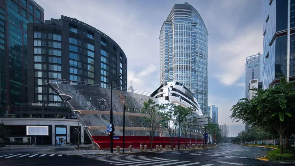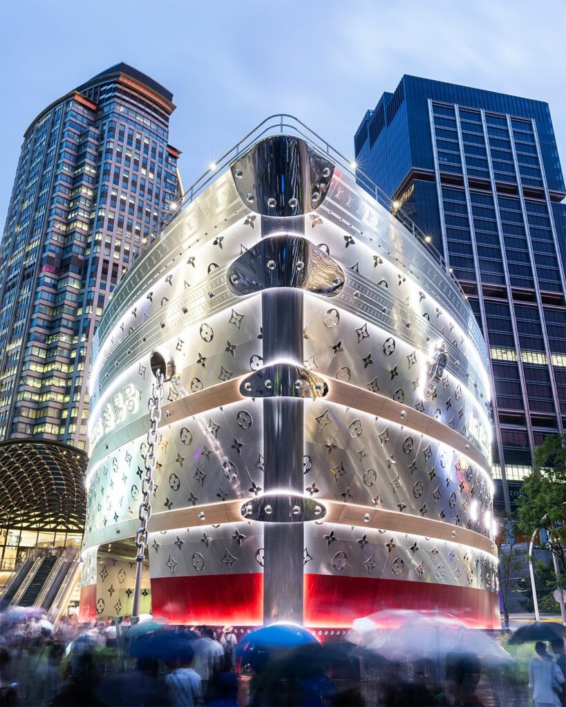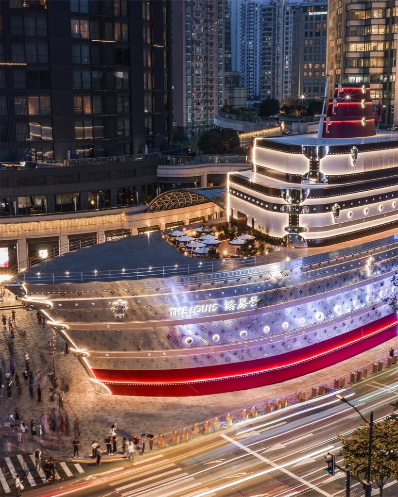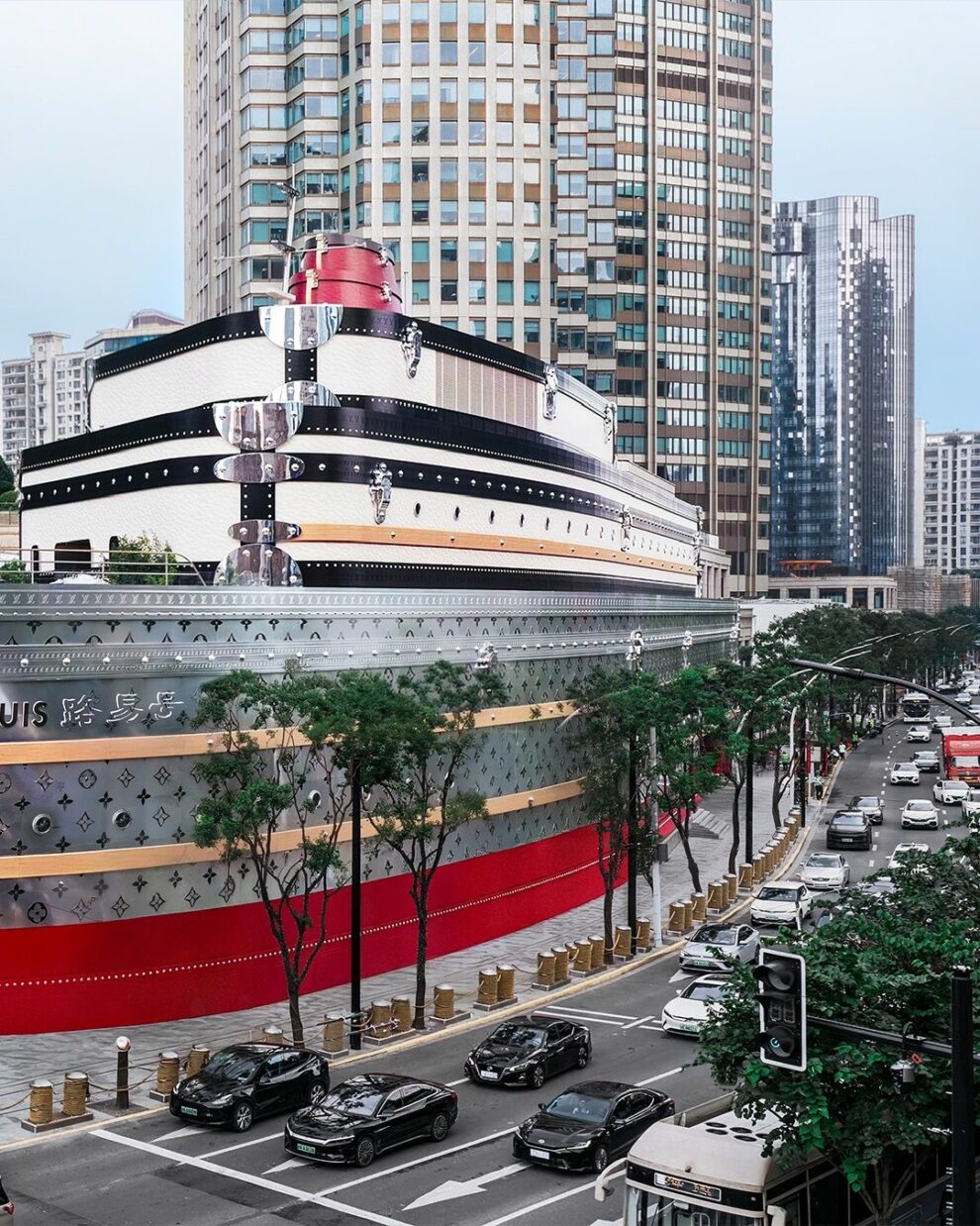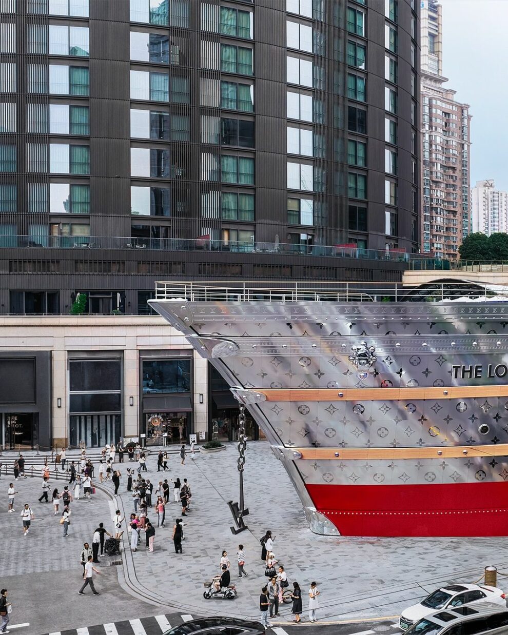 Ce monumental paquebot de croisière étalé sur 1600 m² symbolise l’héritage de la maison Vuitton en matière de voyages, d’innovation et de savoir-faire. Amarré à Shanghai Taikoo Hui dans ce quartier animé de Jing ‘ an qu’on voit là en détail avec le momogramme maison en façade mais aussi ses inscrustations multiples et son ancre Vuitton géante a littéralement médusé les consommateurs chinois lorsqu’il a été dévoilé au public, ce 28 juin 2025.